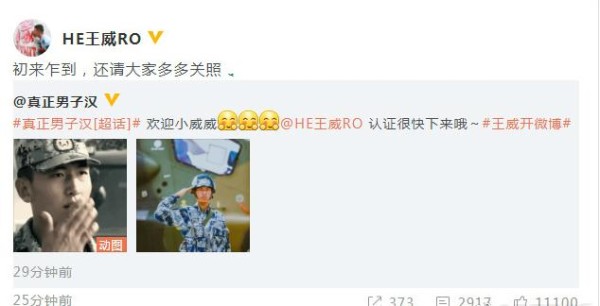 《真男3》班长王威开微博 第一时间与杨幂互关