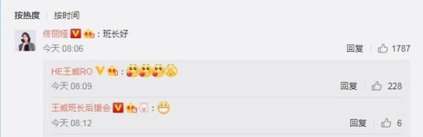 杨幂佟丽娅沈梦辰不同形式与王威微博互动,班长害羞表情回复丫丫