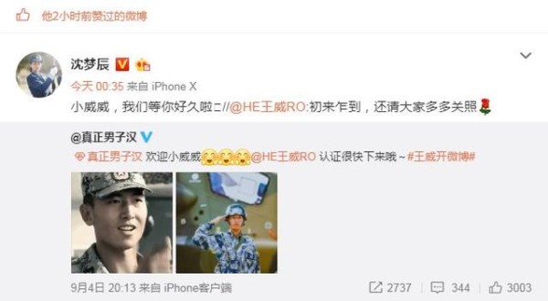 9月4日,王威退役,获得了众位战友的祝福。退伍后,王威开通微博,最先关注的则是他曾经培训的学员杨幂、黄子韬、孙杨、蒋劲夫、佟丽娅、沈梦辰、张蓝心等人,众人也分别进行了“欢迎”。就四位女神而言,王威在节目中时与杨幂玩的最愉快,小威威的名字也是杨幂所起,王威开通微博后最先关注杨幂,也算是对于杨幂的一种回复,尽显好关系。随后杨幂也立即回关了王威,简单的互动尽显对班长的支持。