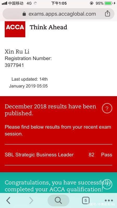 我很烦恼地关掉了手机,因为我以为是星期二出成绩,那个只是提醒我明天要记得看成绩的短信,但是我打开微信,沙河校区服务群里的同学宣告着自己“过了”的好消息,我的手马上开始哆嗦,但没有勇气再看那条短信,因为我一直觉得自己可能过不了SBL,我马上拿出计算器,计算12/13和12/14,12/13=92.3%,12/14=85.7%,我打心眼里感谢这两个算术结果不等于82%,并且全球通过率也不可能达到82%这么高的水平,而短信中清楚地标明的是我的ACCA号,我这才意识到,我可能过了。