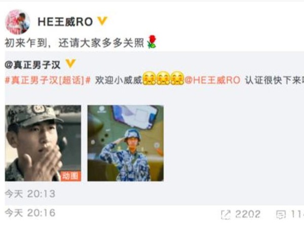 9月4日,湖南卫视的《真正男子汉》第二季中的教官王威开通了微博,并受到广大网友的热烈欢迎。微博上,王威宣布自己开通了微博,并配文:初来乍到,还请大家多多关照。他开通微博的这件事很快便上了新浪微博热搜,网友的反应也是很激烈,纷纷在微博下评论:没问题,班长。