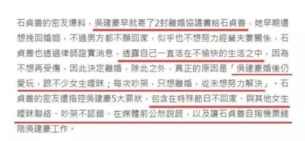 石贞善的密友更是列数吴建豪“不回家、花心、吵架不认错、对媒体说谎、让妻子放下事业陪他工作”等5大罪状。