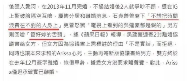 这样的情况下,夫妻分居、离婚的消息频频传出。石贞善的闺蜜曾向媒体爆料,称她并不想离婚,并有意和解挽回,但是吴建豪却很少回家,后来更连续两次寄离婚协议书给石贞善。