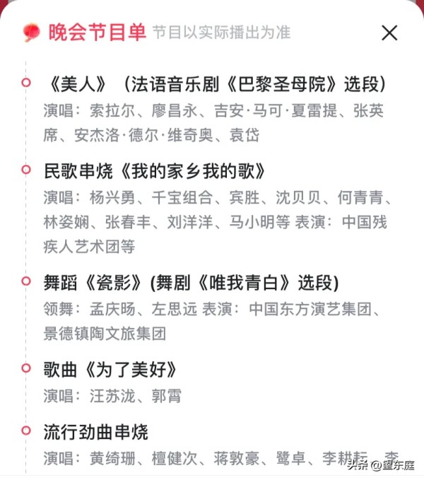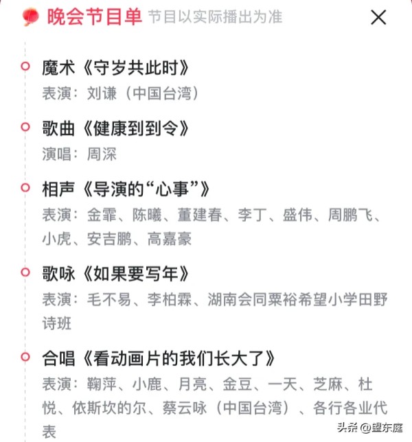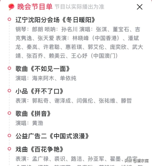 刚刚仔细翻看了节目单,发现很多明星第一次来到了春晚,同时也发现有很多明星是自己不认识的了[捂脸]里头有一个与我同名同姓,我竟然连她(他)是男是女都不知道。
