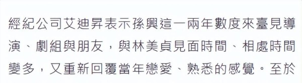 听说了吗?这娱乐圈的爱情故事,还真是比连续剧还要精彩。台媒12月24日的一条新闻直接让不少吃瓜群众一边嗑着瓜子,一边感叹“人生如戏”。消息说,演员孙兴和他的前妻林美贞又复合了,这可是他们第三次重修旧好——一次、两次也就罢了,现在到了“三进宫”的程度,是不是有点太玄乎?经纪公司很快就跳出来确认,说没错,他们确实在一起了。你想啊,这对昔日的爱侣兜兜转转十几年,如今居然还能再续前缘,到底是真情难舍还是生活所迫呢?