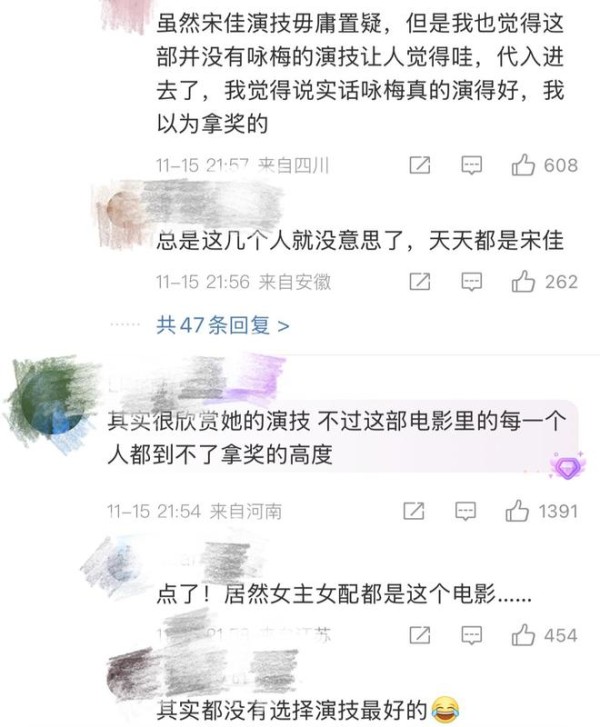 也有网友表示,很欣赏宋佳的演技,但《好东西》这部电影中的每一个角色都没有拿奖的高度。