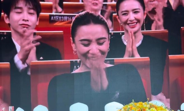 宋佳身后的年轻男演员表情乖张,惊讶的同时又充满羡慕,她身后的女演员露出会心笑容,由衷的佩服宋佳二度封后。