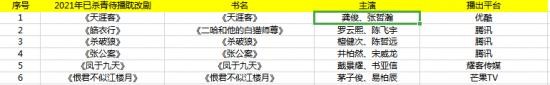 除了爱优腾,芒果TV也杀入了这个战场,截至目前根据不完全统计,2021年已有6部已杀青确定播出的耽改剧,其中腾讯有三部拥有将近一半的优势,优酷和芒果TV都各有一部。不仅如此,芒果TV在2021年的大片剧单中放出了三部耽改剧的海报,其中有两部已经开机正在拍摄中。