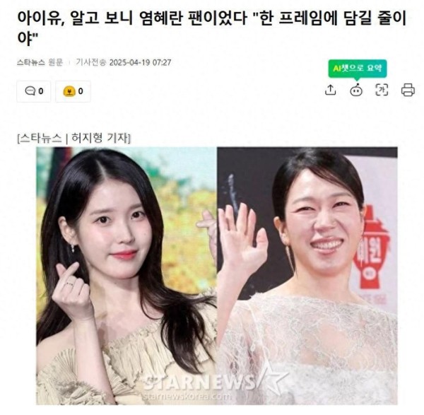 对于韩国知名女星IU自曝,对前辈演员严惠兰的“崇拜之情”,大家怎么看呢?快来评论区和小娱分享吧!别忘了点赞关注,我们下期再见啦~