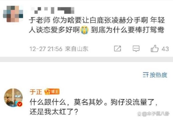 于正回应让白鹿和张凌赫分手问题,称是狗仔没流量,还是我太红了