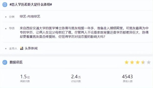 在之前的综艺节目中,女博士要嫁给只有中专学历的男朋友,引起了热议。在微博上,有1.5亿的阅读次数,2.4万的讨论次数。