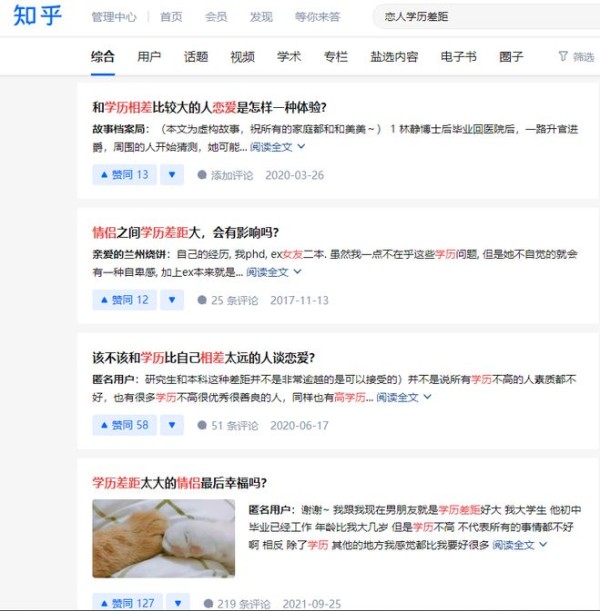 就连在知乎这样倡导多元价值观的网站中,也有很多人旗帜鲜明的反对学历差距大的恋人走入婚姻。