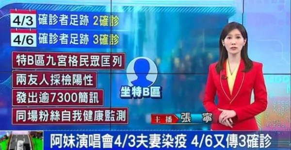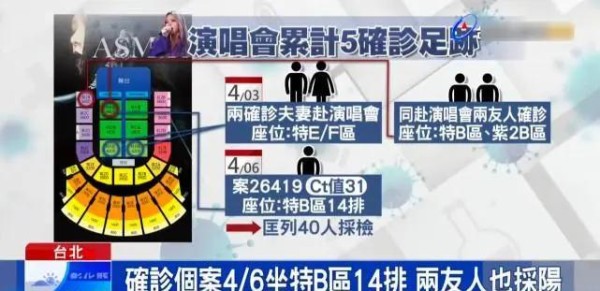 之后的4月13日,又被曝光关联出五例感染者。有台湾省电视台报道,这五例关联病历与张惠妹演唱会有关联。4月3日是一对夫妻(张惠妹粉丝)感染确诊,紧接着4月6日又有3例确诊。