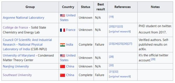 中国的两家是南京大学和东南大学,南京大学的实验引用了闻海虎教授的说法,称派了一个学生在做实验,目前未有结果;东南大学的实验引用的是B站上一个视频,UP主“科学调查局”(东南大学教授)说是没有发现任何超导信号,放到磁铁上也没有悬浮,仪器检测仅有弱抗磁性,疑是杂质所致。