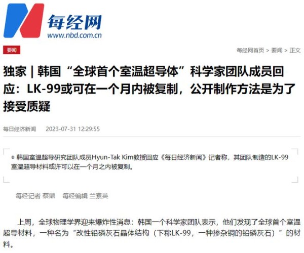 金炫卓的回复第一个确定的消息是,中国《每日财经新闻》已联系到韩国室温超导研究团队成员,美国威廉玛丽学院物理系教授金炫卓,金炫卓教授在回复中称,“其团队制造的LK-99室温超导材料或许可以在一个月之内被复制,其成员也会对LK-99的制作方法进行指导,在文章中公开LK-99的制作方法,也正是为了接受各方的质疑。”