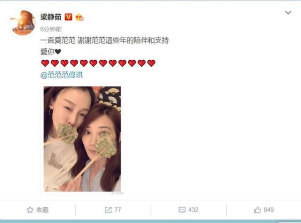 范玮琪被网友指责“大嘴巴”,但梁静茹却没有生气。8月16日下午5点左右,梁静茹发微博:“一直爱范范,谢谢范范这些年的陪伴和支持!”而范玮琪一直没有公开道歉。