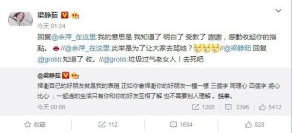 9月30日,张韶涵在微博晒出与成龙、张杰、韩雪、王力宏、张靓颖等明星的合照, 证实了自己的好人缘。所以范玮琪很快就晒出了与梁静茹的合影,回击张韶涵。