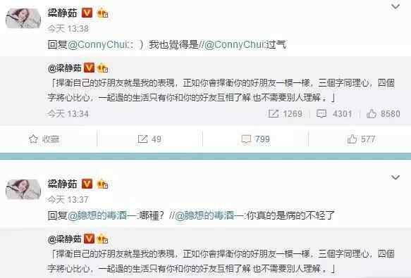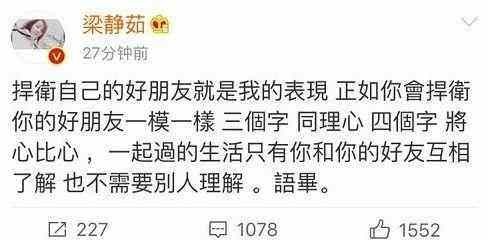 在删了和范玮琪的合照后,梁静茹更新了一条微博霸气护友:“捍卫自己的好朋友就是我的表现 正如你会捍卫你的好朋友一模一样 三个字 同理心 四个字 将心比心 一起过的生活只有你和你的好友互相了解 也不需要别人理解”;与网友互怼时辩解称:“仿佛住在我身体里面的灵魂,你多了解我的朋友呢,我也不会评论你的朋友,请共勉之。多谢许多的关心,谢谢你祝福你一样有一天朋友都会捍卫着你永远永远 这是生命中最美好的事之一”。