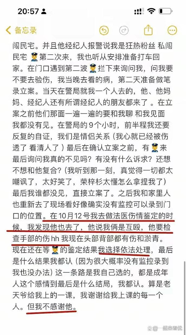 她在文中控诉荣梓杉“动了手”,不仅被摔倒在地,还多处受伤。