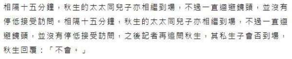 大概过了有15分钟时间,黄秋生的妻子吴惠贞和他的儿子一同前来祭拜,一向低调的吴惠贞全程躲避镜头不接受采访,虽然黄秋生与妻子长期分居,甚至还多次传出婚变的传闻,但吴惠贞始用自己的行动证明,他们两人还没有离婚。