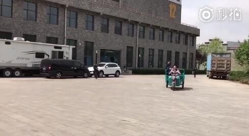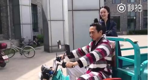 视频中,邓超骑着三轮车载着孙俪,两人穿着拍戏服装像是去片场的样子,十分接地气!
