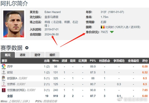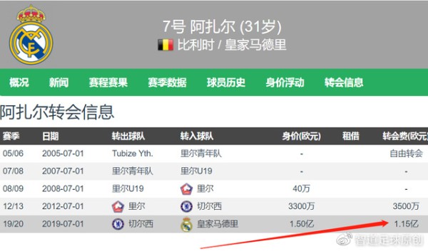 现年31岁的阿扎尔,于2019年夏窗以1.15亿欧元的转会费从切尔西加盟皇马,当时阿扎尔在德转的身价为1.5亿欧元,如今阿扎尔的身价在三年半时光里暴跌至750万欧元,这是皇马队史最亏本的交易。