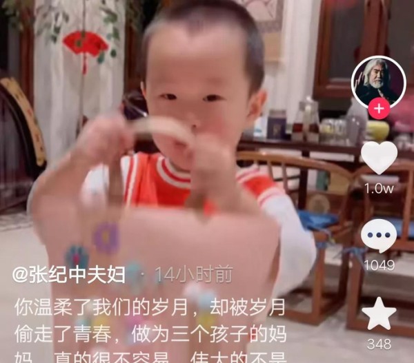 儿子拿着礼物送给妈妈,说话奶声奶气的。张纪中导演则在一旁拿着手机拍视频记录。