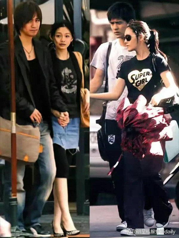 当时的大S脸小紧致,低扎马尾或者双扎麻花辫,都能完美驾驭!简单的黑色印花T恤,也能穿出时尚感!两人穿情侣T恤,像是在拍摄时尚大片!
