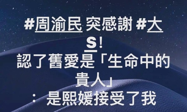 周渝民与大S因2001年共同拍摄《流星花园》而结缘,两人因这部剧的火爆而成为台偶初代顶流偶像。当时大S对这位比她小5岁、乖巧可爱的周渝民青眼有加,甚至认他为干弟弟。在经历一些情感变故后,大S给予周渝民情感上的支持与帮助,成为他事业和人生中的重要角色。在《我们与恶的距离 II》中,周渝民有一段深情的独白:“我曾以为,我们能接住所有人的苦难,但现实是,我们连自己的都接不住。”在接受采访时,当被问及出道以来是否有遇到“接住他的人”,他深情地回答:“在我表演不佳时,是蔡岳勋导演给予我支持;在我情绪低落时,熙媛(大S)接住了我。”他感激地将大S和《流星花园》的导演蔡岳勋列为自己事业早期的贵人,他们在他遭遇困境时,提供了专业与情感上的援助。
