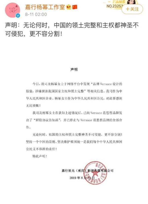 就在11日的凌晨两点,已经和范思哲合作四十多天的杨幂,通过微博@嘉行杨幂工作室 发表声明,称已经停止与Versace范思哲品牌的全部合作,并且表示“无论何时,祖国的主权和领土完整神圣不可侵犯,更不容分割!坚持一个中国的原则、坚决维护祖国统一是我们每个中华人民共和国公民义不容辞的责任!”。