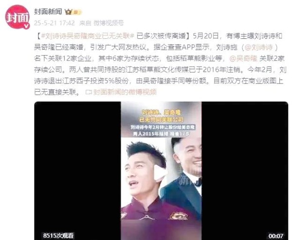 谈及吴奇隆与刘诗诗这对夫妻,他们的婚姻状况似乎总是成为外界关注的焦点。自去年12月以来,有关他们离婚的传闻就不断在社交媒体上发酵。先是网红在直播间爆出“刘诗诗已与前夫断联”的消息,随后在今年2月,夫妻二人名下的公司股权发生转让、企业注销等动作,这些细微的变动都被媒体和网友解读为“商业切割”的信号。甚至吴奇隆的前妻马雅舒在社交媒体上点赞关于两人离婚的评论,也能引发一场热搜风波。