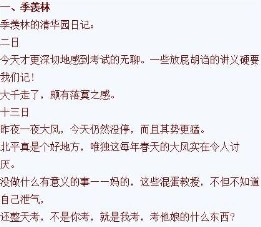 日记中,季羡林老先生吐槽自己的生活平平无奇,因为最近的考试深感无聊,自己在这段时间中并没有做什么有意思的事情,反而是这些教授们成天考试,不是你考试就是我考试,实在忍无可忍了,他爆了一句粗口又无可奈何。