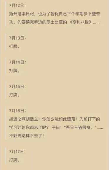 除了季羡林的日记之外,其实国学大师们都是普通人,比如就拿胡适来说,日记中充斥着打牌、打牌、打牌,唯独有一日上面写说:“胡适啊,你不可以这么堕落,你要反省,难道你忘记自己曾经做过的那些计划了吗?”结果第2天仍旧是打牌。