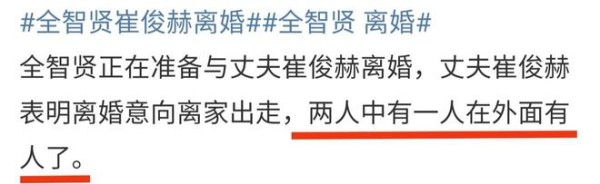 据爆料称,全智贤的婚姻在最近半年触礁。早在去年12月,崔俊赫已经离家出走,并且明确表达出离婚意向。但是全智贤并不愿意,她目前拍摄了数十个广告,如果离婚导致形象受损,可能要支付高达300亿韩元(1.8亿人民币)的违约金。