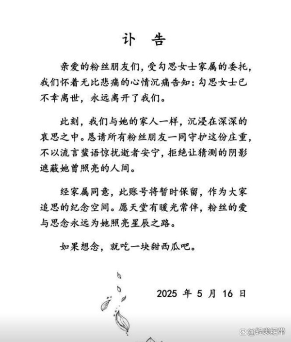 5月16日,网红“勾思”发出讣告,写着“愿逝者安息,愿天堂没有流言蜚语”。看到消息,粉丝们都很震惊。几天前还在看她直播,没想到她突然去世了,大家纷纷怀疑是不是真的。