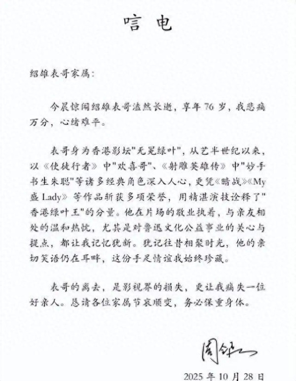 2025年10月28日凌晨,香港资深演员许绍雄因病逝世,享年76岁。消息传出后,无数观众在社交平台自发悼念,称“一个时代的配角记忆落幕了”。TVB发布官方哀悼,合作多年的佘诗曼、杨千嬅、惠英红等艺人纷纷发文追思。而在众多悼念声中,一条来自鲁迅长孙周令飞的唁电尤为引人注目——他称许绍雄为“表兄”,并深情回忆两人在鲁迅文化公益事业中的交流点滴。这位被观众称为“欢喜哥”的演员,不仅以精湛演技留下无数经典角色,更以低调谦和的为人,串联起一段跨越百年的家族情谊与文化传承。