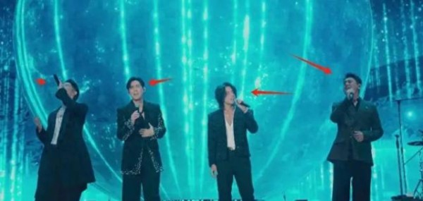 朱孝天站在舞台一角,黑色西装的他们三个,神情自然、眼神交流肆无忌惮,唯独他,穿着棕色西装,一副格格不入的模样。