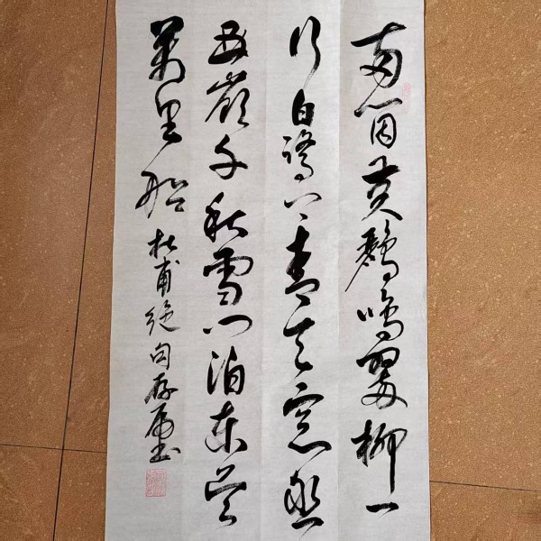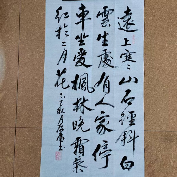 整幅作品采用竖幅构图,布局疏朗,行气流畅,自右而左依次书写,符合传统章法,富有节奏感。从第一行“远上寒山石径斜”起,笔势舒展大方、起伏有致,映照出山路蜿蜒、寒意渐浓的画面。全诗诗意逐步展开,行书线条也随之节奏明快、意态生动,既传达了杜牧诗中的动感,也体现了方老师对诗意与书艺内涵的双重把握。