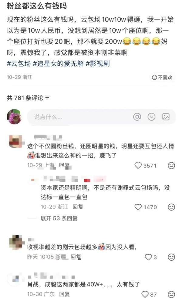 小红书有一条关于云包场价格的推文,仅评论区一条“这个不仅圈粉丝钱,还要明星互相云包场还人情”的相关评论点赞就超过3500次。这或许侧面印证了云包场已从单纯的宣发或补救手段,彻底沦为网友眼中“你包我、我包你”的圈内份子经济。而这种转变并非一日之功。