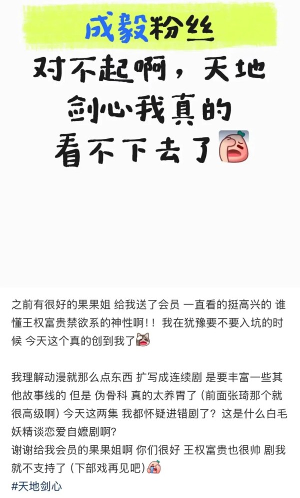 比如《天地剑心》以47.7万次云包场上热搜,大结局播放量4800万,但豆瓣分从6.8跌至5.9,一星占比21%,更有抢到云包场的网友在小红书反向拉踩;腾讯S+剧《长安的荔枝》,据《新黄河》披露日投2万~3万份包场,总开支数百万,最终也未破站内3万热度;景甜、张晚意《似锦》完结5天追加包场,狐厂娱乐观察和影视毒舌等多家公众号认为,系数据不达标后的补救,属“宣发保底”变种。