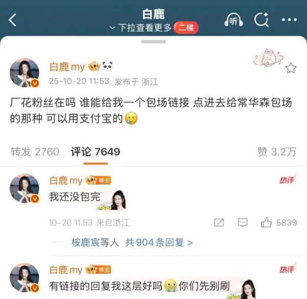这种市场寒意下,仅靠少数主体已撑不起数据门面,云包场的“众筹式”升级成为必然,而这股压力最终大量传导至粉丝群体。而云包场2.0时代,最忙的倒霉蛋们还是粉丝。他们既要为正主剧集氪金,还要响应艺人号召为其好友包场,比如白鹿曾求问粉丝如何为搭档常华森新剧包场,这间接带动了粉丝为好友包场。大粉则常以“不爱正主”为由裹挟小粉,要求粉丝集资冲榜,导致粉丝经济负担加重。