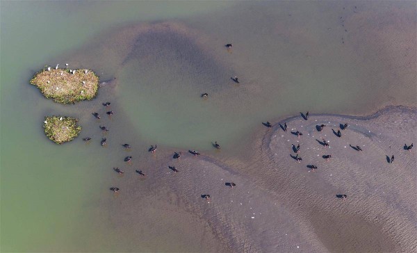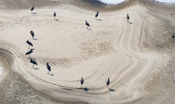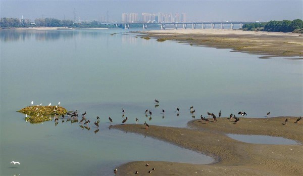 11月14日,在武汉长江天兴洲沙滩上,一群约40只的黑鹳时而飞翔、时而到江水中捕鱼。黑鹳是国家一级保护野生动物,其身披金属光泽的黑色羽毛、红色的长喙、优雅的大长腿,被称作“鸟中大熊猫”。已连续12年都来天兴洲越冬,成为武汉冬候鸟的明星。