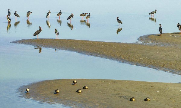 11月14日,在武汉长江天兴洲沙滩上,一群约40只的黑鹳时而飞翔、时而到江水中捕鱼。