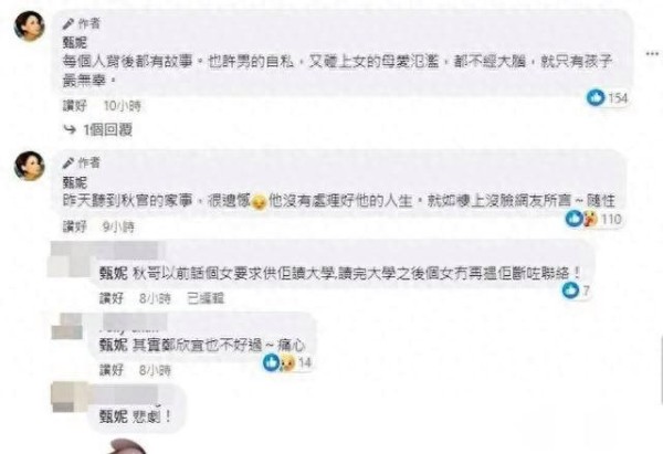 网友们纷纷猜测,甄妮所说的“错误”可能是指郑少秋在处理家庭问题时的一些不当行为。虽然大家并不清楚具体是什么事,但可以肯定的是,这件事对郑欣宜造成了了一定的伤害。有人认为,这可能是郑少秋在离婚后对女儿的抚养问题上没有给予足够的关心和支持;也有人猜测,这可能涉及到郑少秋的私生活问题。