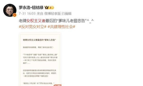 有人说罗永浩等人是因为赚不到女人的钱才准备切割女权市场,其实并没有那么简单。从他最近的一系列言行来看,该嘲讽男性还是照旧,该站队女权依然坚定。“利益为先”的解读未免过于片面,更重要的是,在极端化言论逐渐增多、理性讨论空间变窄的大环境下,即便是老牌“女性之友”,也不得不给自己留条后路。
