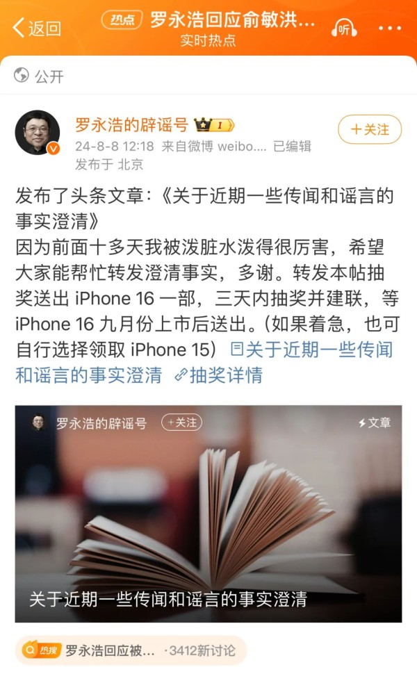 俞敏洪多年好友张翔曾发文曝罗永浩“五宗罪”,称其不择手段,是人品极差的跳梁小丑。8月8日,罗永浩在微博发布5000字长文《关于近期一些传闻和谣言的事实澄清》,进行了回应。