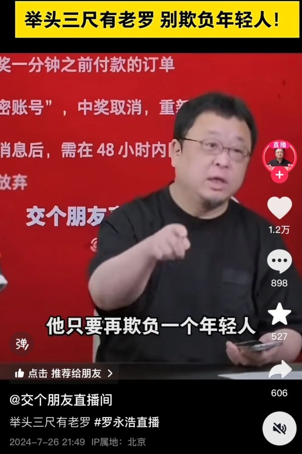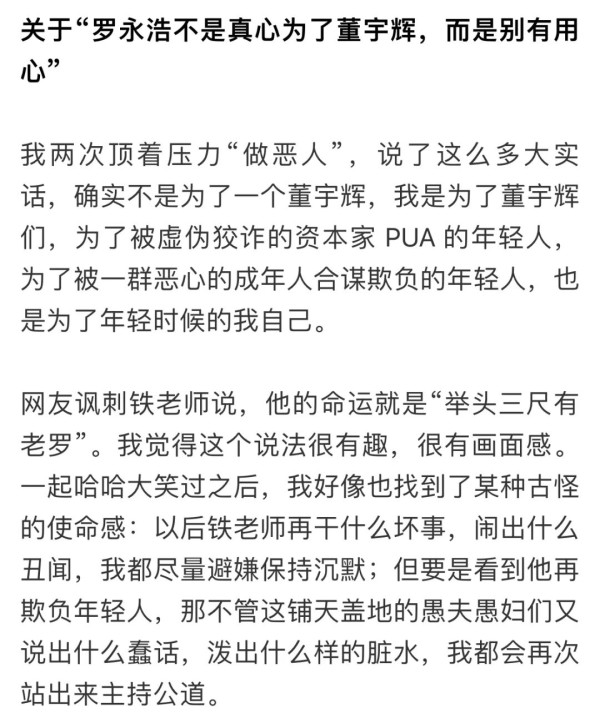 网友讽刺俞敏洪说,他的命运就是“举头三尺有老罗”。罗永浩在此次长文中表示这个说法很有趣,很有画面感。