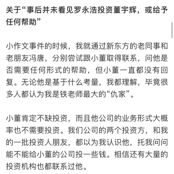 罗永浩称:“小董肯定不缺投资,而且他公司的业务形式大概率也不需要投资。我们公司的两个投资方,和我的一批投资人朋友,都以为我认识他,托我问问能不能给小董的公司投一些钱。相信还有大量的投资机构也都联系过他。”