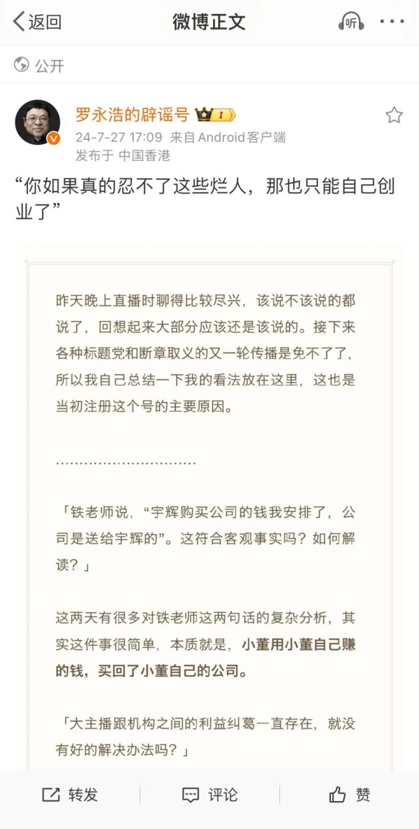 7月27日,罗永浩发布微博长文总结了其对董宇辉独立单飞事件的看法及评价:“你如果真的忍不了这些烂人,那也只能自己创业了。”