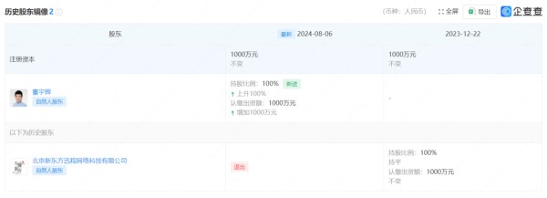 企查查显示,近日,与辉同行(北京)科技有限公司发生工商变更,原全资股东北京新东方迅程网络科技有限公司退出,新增董宇辉为股东并全资持股,同时俞敏洪卸任该公司监事。